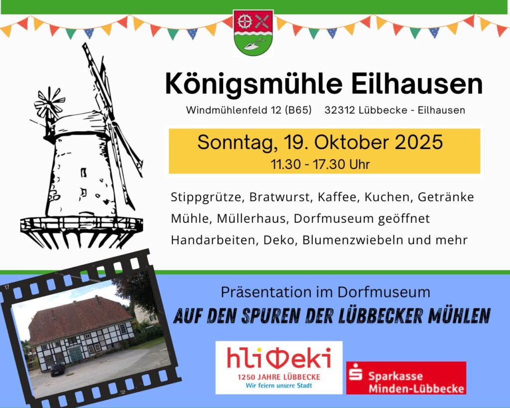 Am Sonntag, 19. Oktober, begehen wir den letzten Mühlentag des Jahres und in Eilhausen sind Mühle, Müllerhaus und Dorfmuseum geöffnet! Ab 11:30 Uhr wird ein geselliger Nachmittag mit Speis und Trank geboten. Im Dorfmuseum erhalten Interessierte einen spannenden Einblick in die regionale Mühlengeschichte.