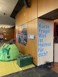 Etwas, das auch interessant war, aber leider schon wieder abgebaut wurde, ist der „Kleine Hörspiele-Raum“. Hier wurden Interviews, die mit „Lübbecke-Weggehern und Wiederkehrern“ gemacht wurden von Schauspieler:innenn eingesprochen und an vier Orten im ehemaligen Restaurant der Stadthalle als Hörspur wiedergegeben.