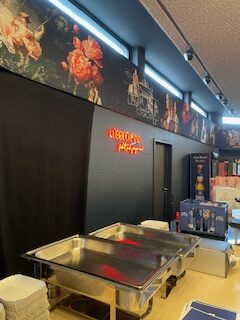 Eine Überraschung bot auch das Foyer der Stadthalle. Hier hat die Kulturmanagerin der Stadt Lübbecke selbst umgestaltet. Das Farbkonzept für die Halle entnahm sie aus dem Corporate Design, welches sie als versierte Kommunikationsdesignerin (mit Schwerpunkt: Bühnenbild) für das Stadtjubiläum entworfen hatte. Auch die Logos „HLIDBEKI-Wir feiern unsere Stadt“ und „Lübbecke 1250- …fühlt sich jünger an“ die das gesamte Stadtjubiläum kraftvoll und kreativ stempeln, stammen aus ihrer Hand (denn sie war nicht nur in Theatern, sondern auch lange Zeit in großen Werbeagenturen als Art-Direktorin beschäftigt). Letzteres kam nun als LED-Schriftzug im Foyer hinter der Bar zum Einsatz. Aber besonders interessant ist der „50 Meter Kunstgeschichte-Fries“, den sie für das Foyer der Stadthalle Lübbecke gestaltete. Das Gute ist: “ Der bleibt da jetzt erstmal hängen“!