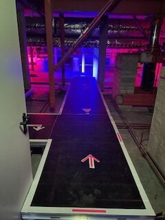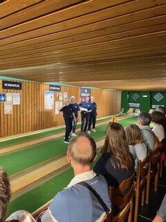 Hier wurden Figuren aus der Geschichte der Stadthalle – mit leichten dramaturgischen Aufladungen- wieder lebendig. Man erlebte einen cholerischen Koch, der seine drei Azubis in die hohe Kunst des Kochens und der „bunten Abende in der Stadthalle“ einweisen wollte. Und das tat er (gespielt von Profi-Schauspieler Oliver Seidel) auf eine ganz egozentrische Weise und mit viel Nebel. Lob gilt auch den drei jungen Schauspiel-Elevinnen, die mit gerade mal 13 Jahren ihre Rollen mit viel Können, Witz und Mut ausfüllten. Genauso jung war dann auch die „schlechtgelaunte Serviererin“, die im Clubraum gekonnt die „Hochzeitsgesellschaft“ in Schach hielt. Hier spielten sich zwei Brautpaar-Elternpaare grandios gegeneinander aus – solange, bis sie bemerken, daß das Brautpaar nicht kommt. Das kriegen sie auch nur mit, weil ihr egozentrisch-nöliger Teenagersohn die auf Instagram veröffentlichten Bilder der spontanen Hochzeitsreise des Brautpaars am Handy verfolgt. Sehr lustig- auch weil die Wortgefechte an Loriots Stil erinnerten. Im Keller dann wird man Zeuge, wie vier knauserige Kegeldamen den ganzen Abend an einer Pizza und einem Mineralwasser herumknabbern, was nicht lukrativ für den charmanten Barmann ist. Aber sie sind wirkliche Könnerinnen in Sachen „Alle Neune“. Die drei Feuerwehrleute, mit denen sie sich die Kegelbahnen teilen, sind dann auch etwas neidisch, aber nicht weniger kampflustig. Wenn da nur nicht schon Alkohol im Blut wäre- denn sie feiern eine Beförderung. Echt blöd, daß da auf einmal ein Noteinsatzruf kommt. Und gut, daß die vier Damen sie zum Einsatz fahren können!